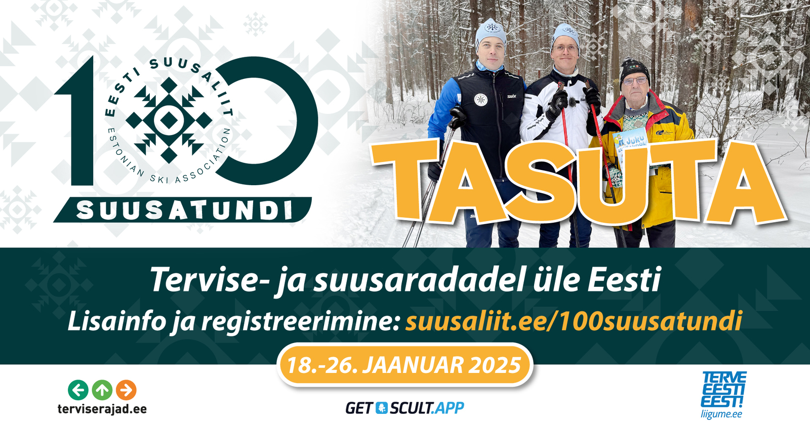 100 suusatundi toimub ajavahemikul 18.-26. jaanuar 2025 ja tasuta registreerimine on avatud SCULT.app´is, mille leiad oma nutitelefonist Google Play või App Store'is.